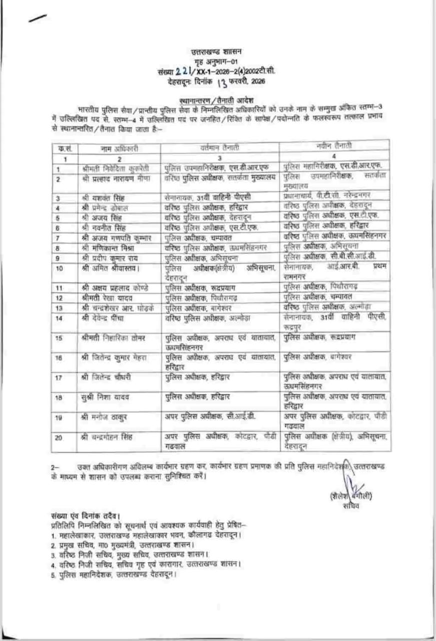उत्तराखंड पुलिस महकमे में भारी फेरबदल: 20 IPS और PPS अधिकारियों के तबादले, देहरादून और हरिद्वार को मिले नए कप्तान