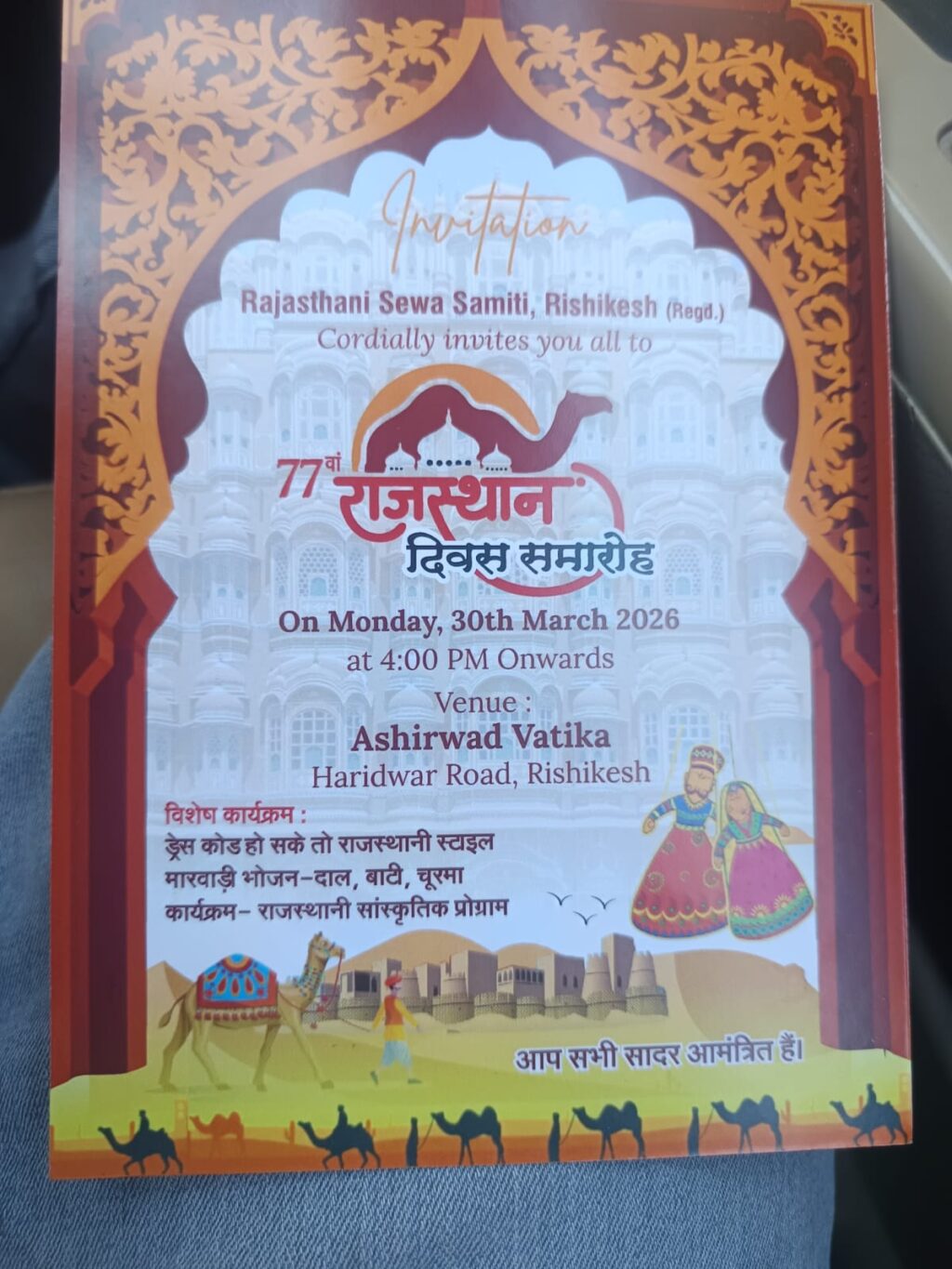 तीर्थनगरी ऋषिकेश में राजस्थानी संस्कृति और परंपराओं का संगम होने जा रहा है। राजस्थानी सेवा समिति ऋषिकेश द्वारा आगामी 30 मार्च को 77वें राजस्थान दिवस के अवसर पर एक भव्य समारोह का आयोजन किया जा रहा है। समिति द्वारा साझा की गई जानकारी के अनुसार, यह उत्सव आशीर्वाद वाटिका, हरिद्वार रोड, ऋषिकेश में आयोजित होगा। कार्यक्रम का शुभारंभ शाम 4 बजे से होगा। जिसमें राजस्थानी समाज के साथ-साथ शहर के गणमान्य लोग भी शामिल होंगे। इस कार्यक्रम में मुख्य अतिथि के रूप में कई आईएएस और आईपीएस अफसरों के शामिल होने की भी उम्मीद है। समारोह को यादगार बनाने के लिए कई विशेष कार्यक्रमों की रूपरेखा तैयार की गई है। जिसमे राजस्थान की समृद्ध विरासत को दर्शाते हुए विभिन्न सांस्कृतिक कार्यक्रमों का आयोजन किया जाएगा। आयोजकों ने अतिथियों से आग्रह किया है कि यदि संभव हो, तो वे राजस्थानी स्टाइल में शिरकत करें, ताकि कार्यक्रम में पारंपरिक रंग पूरी तरह से नजर आएं। मेहमानों के लिए खास तौर पर राजस्थान के प्रसिद्ध व्यंजन दाल, बाटी और चूरमा का प्रबंध किया गया है। राजस्थानी सेवा समिति ने सभी प्रबुद्ध जनों को इस उत्सव में सादर आमंत्रित किया है। गौरतलब है कि राजस्थान दिवस हर साल राजस्थान राज्य के स्थापना दिवस के रूप में मनाया जाता है और ऋषिकेश में रह रहे राजस्थानी मूल के लोग इसे अपनी जड़ों से जुड़े रहने के एक उत्सव के रूप में मनाते हैं।
